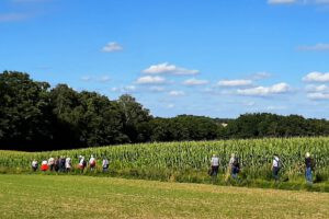 Bei der Eröffnungswanderung gab es auch Kaffee und Kuchen - die Wandergruppe auf dem Weg zum Hofcafe Tschritter in Klein Nindorf.